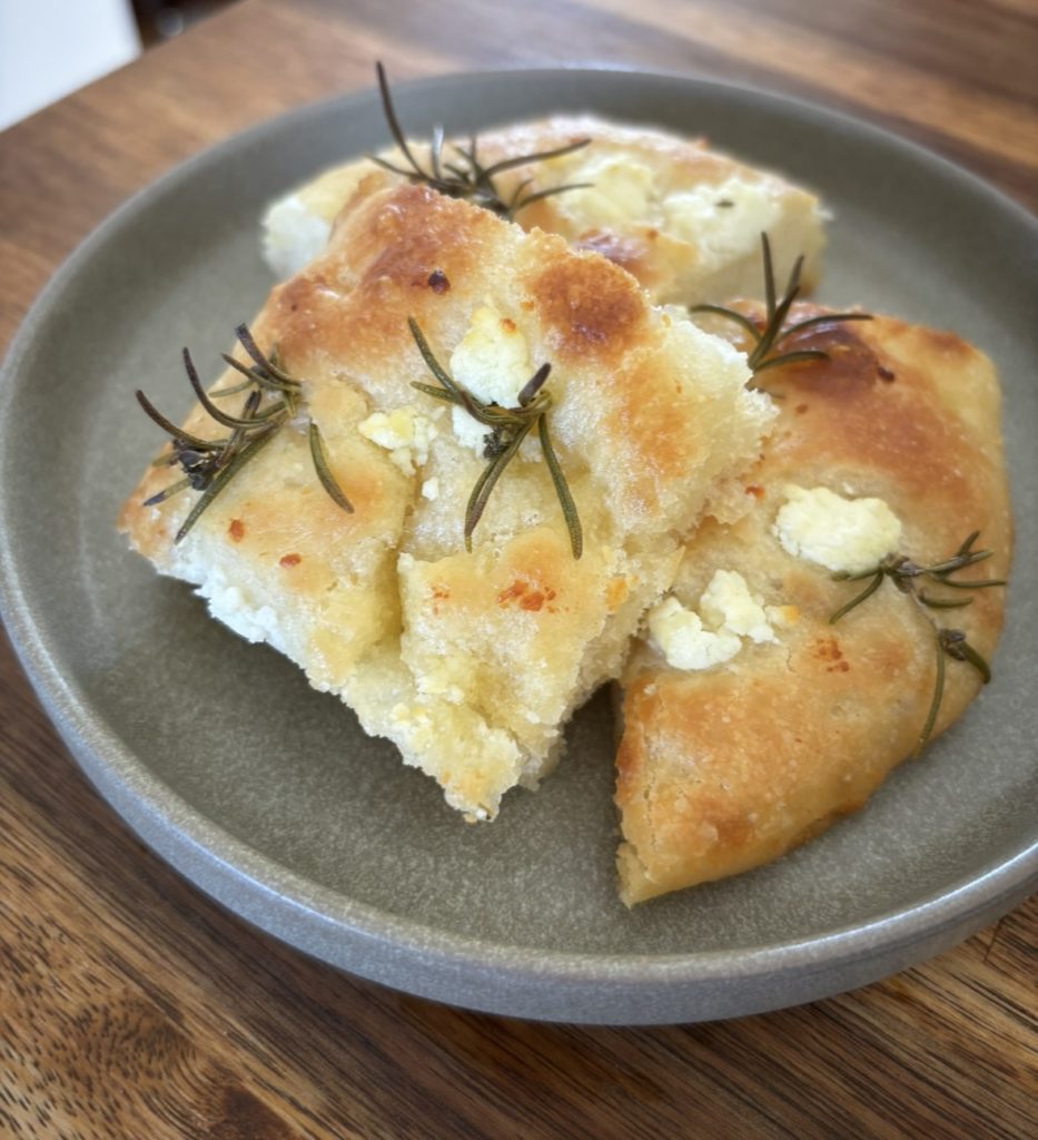 庭で積んだローズマリーとゴートチーズのフォカッチャ。